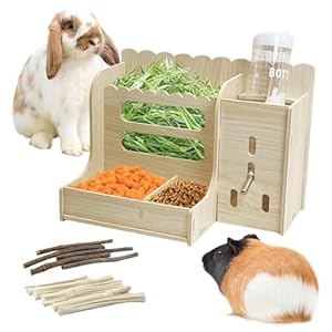 Hamiledyi Rabbit Hay Feeder Guinea Pig Food Holder Bunny Wooden Food Bin Feeder with Water Bottle Small Animals Hay Manger Wood Food Bowls for Guinea Pigs Rabbits Chinchillas Bunnies