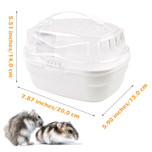 Product Size:Dwarf hamster travel carrier size is 7.87×5.90×5.51 inches/20.0×15.0x14.0 cm,suitable for small animals such as hamsters,dwarf hamsters, guinea pigs,hedgehogs