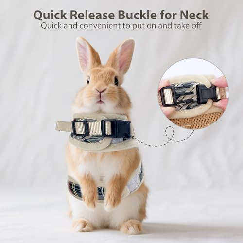 AIITLE Adjustable Bunny Harness & Leash Set – Soft Mesh Liner, Comfort Fit Plaid Pattern Vest with Magic Tape Design, Portable for Small Animal Pets Puppy Cat Rat Squirrel Ferret, Beige L