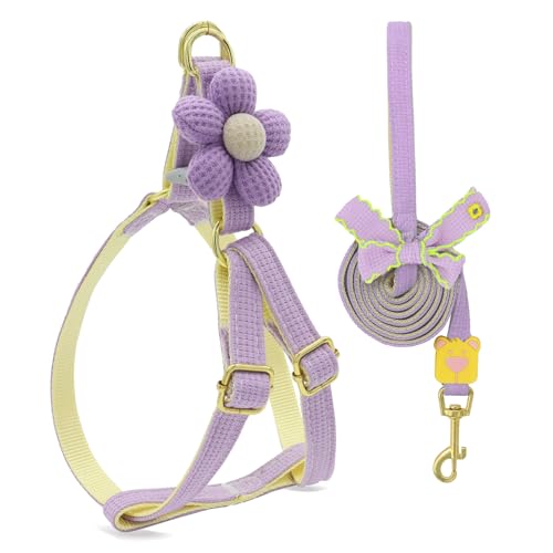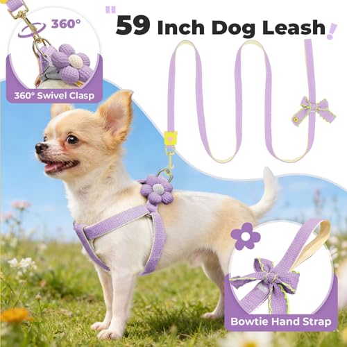 PETCARE Cute Flower Dog Harness and Bowtie Leash Set Easy Walk Puppy Dog Halter Harness for Small Dogs Girl Step in Dogs Harnesses with Buckle (Purple, Chest Adjustable 9″-14″, Rope Width 0.39″)