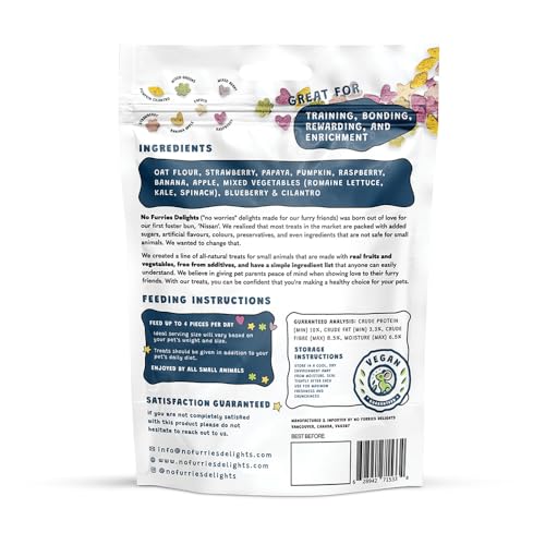 [CRUNCHY, BITE-SIZED & MADE IN SMALL BATCHES] – No Furries Delights is a Canadian-based small business that specializes in creating wholesome and intentional small animal treats and chew toys. Our treats are made crunchy and bite-sized to satisfy your pet’s instinct to chew while providing better control over their sugar intake. Crafted in small batches, our treats are packaged in a resealable bag to ensure maximum freshness